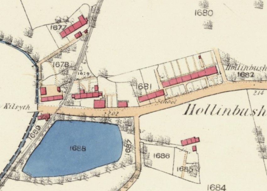 The school at Hollandbush (Hollinbush on the 1st edition Ordnance Survey map) was located on the north side of the main road from Bonnybridge to Kilsyth, a little to the west of Banknock House and only 400m west of the parochial school at Haggs. Hollandbush School belonged to the United Presbyterian Church and was used as a preaching station of Dennyloanhead Church.