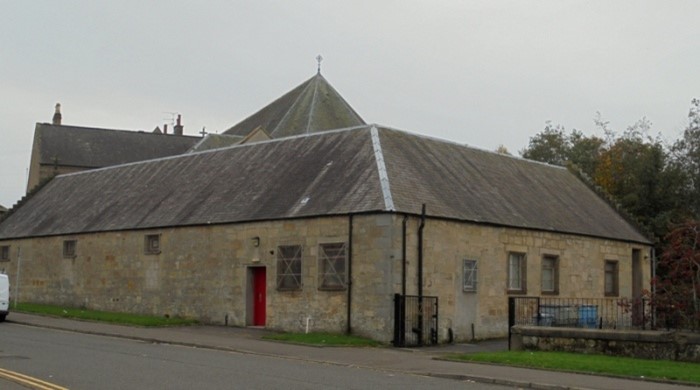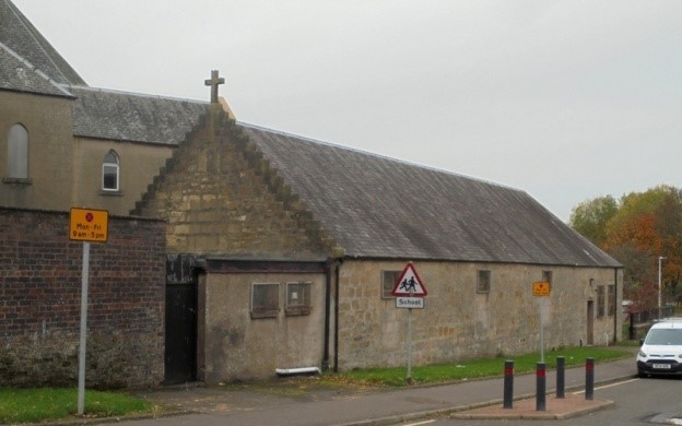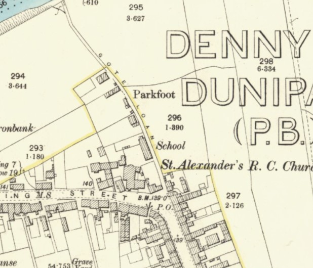 In 1858 moves began to build a Roman Catholic chapel and school at Denny. Land was acquired on the west side of Gote Loan and the school was opened on 1 December 1861. It was a small building with its east gable against the road. It was new at the time that the Ordnance Surveyors wrote their report: