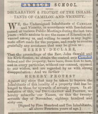 Rather late in the day, the general populous of Camelon became aware of the transaction and at a well-attended meeting at the School they accused the minister and a small party of fanatical supporters of usurping the public rights to Camelon School and calling themselves a school committee,