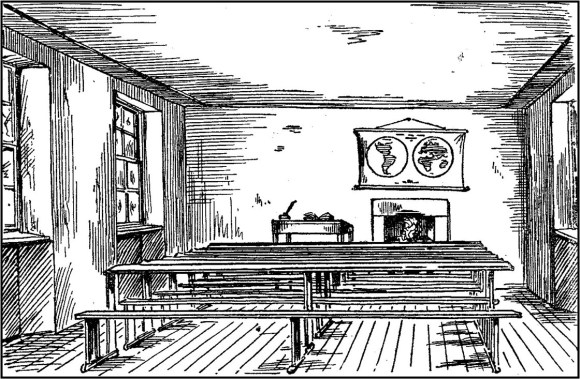 In 1775 an agreement was entered into between the Heritors and the Kirk-Session whereby it was provided that by the latter paying to the Heritors the sum of sixty pounds sterling as a portion of the expense of building a school and schoolmasters’ houses, they (the Session) would be relieved of the annual payment of three pounds. The new schoolhouse was situated on the north side of Manor Street (later the property of Mr James Forgie who used it as a joiner’s shop).  In 1898 James Thomson, assistant art master, Falkirk, produced a sketch of the interior of the English schoolroom at Manor Street from descriptions given to him by those who attended it latterly.  The size of this room was 29ft by 18ft, while the grammar room was only 12ft by 18ft.  Originally it had an earth floor.