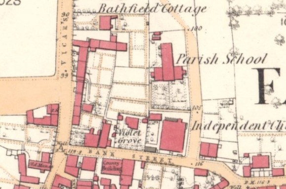A neat and substantial building with playground and garden attached.  Situated off Bank Street.  Was erected at the expense of the Heritors of the parish.  It comprises two distinct parish schools, viz a Grammar School and an English School.  The teacher of the former receives the usual parochial schoolmaster’s allowance, and a house and garden, which are attached to the school, rent free.  The remainder of his salary is derived from school fees, it is not endowed.    The branches taught are classics, German and mathematics.  Average attendance about 40.  The teacher of the English School also receives the parochial schoolmaster’s allowance from the Heritors as well as a dwelling house and garden.  The remainder of his salary is derived from school fees.  Affords tuition in the various branches of an English and commercial education.  Average attendance about 105.”