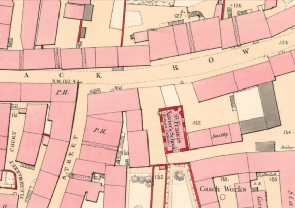 “A substantial building one storey high, slated and in good repair. Situated in Back Row. Was erected by voluntary contributions from the members of St France Xavier’s Church, and other friends, and supported also by voluntary contributions from said members and school pence. Affords tuition in the rudiments of an English education. Average attendance about 120.”