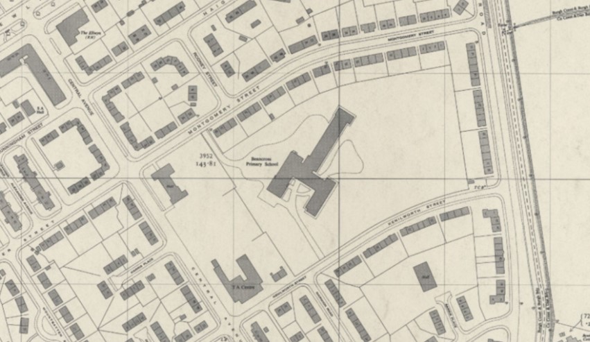 Designed by the Stirling County architect, A.J. Smith, 1956-58. The building has large areas of glass panelled walls topped by shallow-pitched ribbed copper roofs. The main block, which is orientated SW-NE is of two storeys. The single storey blocks at the south-west end of the school are for the younger children. Beancross had 487 pupils and a staff of fourteen in 1961.