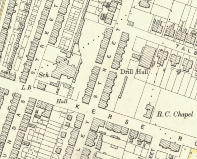 The amazing growth of the town meant that even this was not sufficient and in 1883 William Black was back with plans for a single storey extension to provide for an extra 55 pupils at a cost of around £300. Slight amendments to the plans were made at the suggestion of Mr Jolly, the Education Inspector and in 1884 the work went ahead. Not surprisingly this was still insufficient and in 1886 the Bethany Hall was rented to take the infants. Now an extra storey was added to the extension at Dundas School! This provided accommodation for a further 220 scholars at a cost of about £1,200. It now consisted of the infant department, nine classrooms for standard work, and two classrooms for secondary education, with a teachers’ room – in all 14 rooms with a theoretical accommodation of 780, manned by 15 teachers. Lighting was by gas. It opened on 12 October 1886. A & W Black, architects.