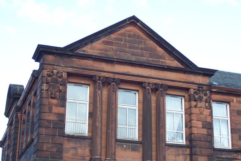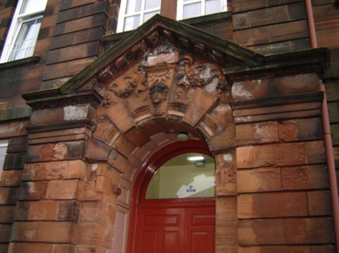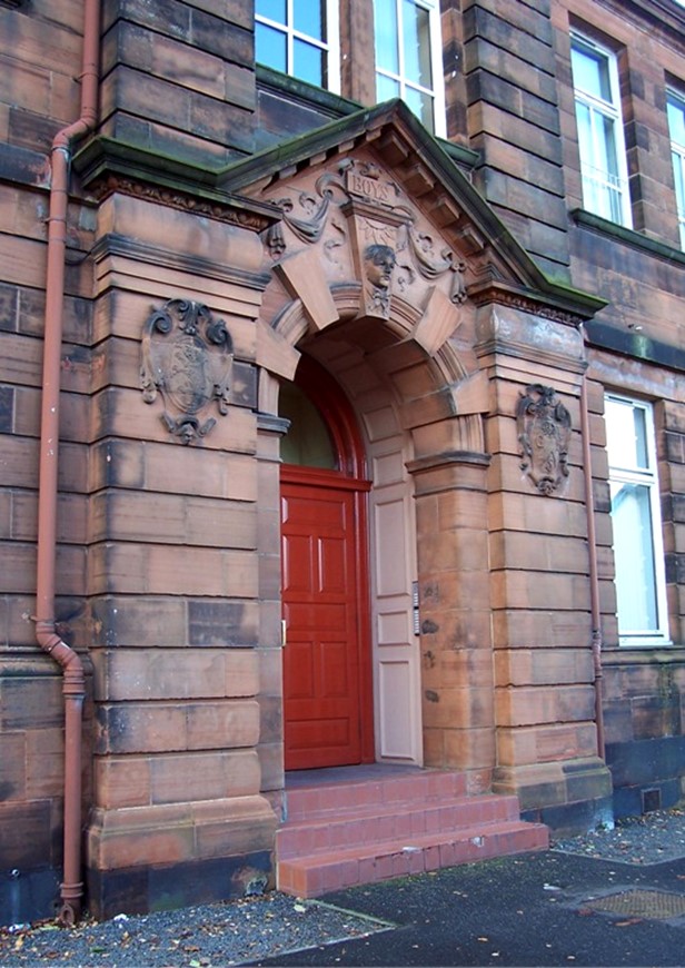 The building sits on a substantial plinth of polished ashlar blocks, offset along its top by a moulded course. Above this the ground floor has channelled masonry up to a plain string course. The channelling continues on the end piers flanking the three advanced bays of the next floor up. The whole is finished with a moulded eaves course. The side elevations have an advanced central bay with broad channelled angle piers crowned by segmental pediments. On the ground floors of these bays open-pedimented aedicules contain round-arched entrances with Gibbs-like voussoirs – one for boys and one for girls each with a carved keystone depicting the head of a child of the corresponding gender. Escutcheons flank the doors. Inside, stained glass windows by Meikle decorated the two light wells and colonnaded arcading the galleries. The school motto “Semper paratus” – always ready – was emblazoned across the glass roof of the central hall.