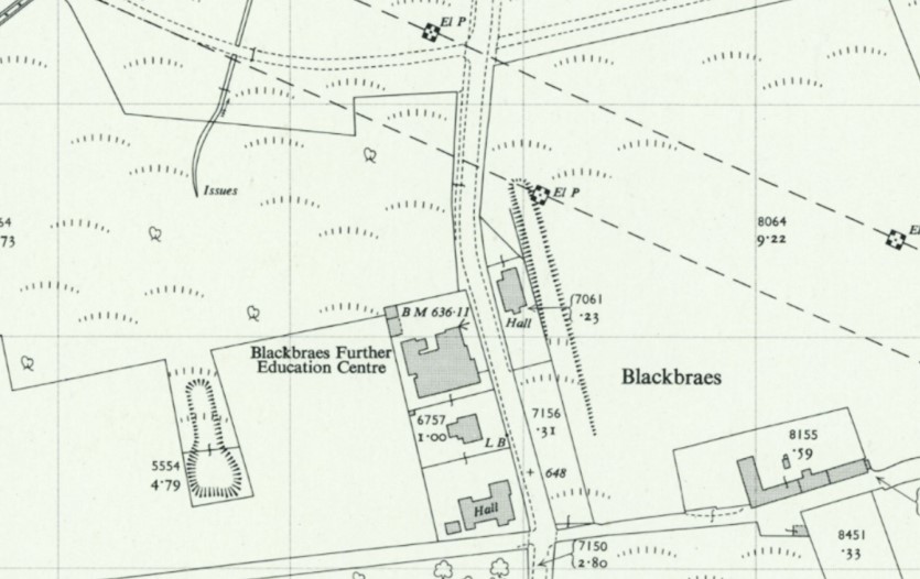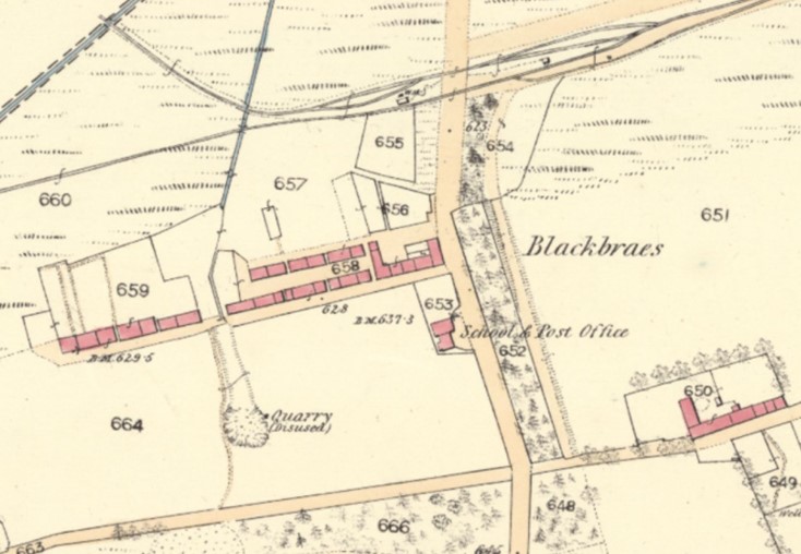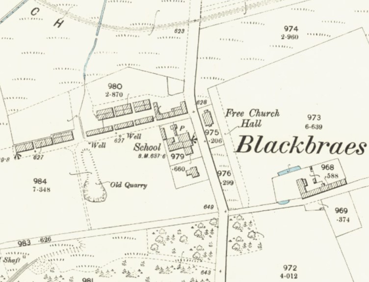 “A small one storey building at Blackbraes erected by the proprietor of the surrounding coal works, as a school for the education of the colliers’ children, the average attendance is 180, two thirds of which are males. Reading, writing and arithmetic is the course of education taught, the teacher receives no other payment but the school fees for his support, he having the house rent free. There is a post office established in the same building, it has one arrival and one despatch daily, the former at 10.30am & the latter at 4pm. Property of Jas Russel Esq, writer, Falkirk.”