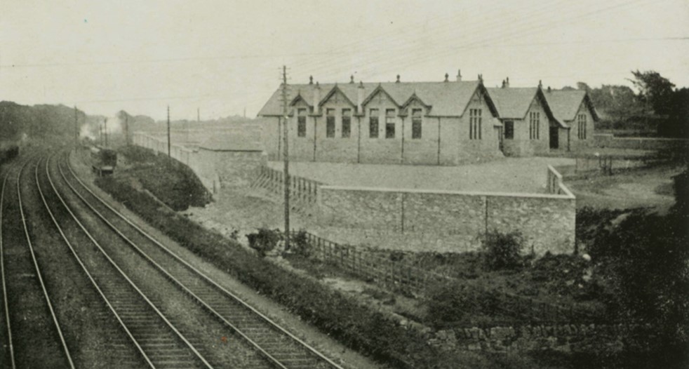 Building operations began at the new school at Redding in February 1902 and it opened on 11 May 1903. Mr Louden, the headmaster of the old village school, his staff and his pupils transferred over. It was situated to the south-east of Redding village, opposite to Blair’s Cottages, with the Edinburgh Railway line bounding the north side. The building was designed by Alexander Gauld, architect in Falkirk, to accommodate 400 scholars, and the total cost was between £4,000 and £5,000. It was one storey high, built of freestone. The front elevation facing the road consisted of three well-proportioned gables, each containing large three-light mullion windows, with two entrance porches. As the building was set on a sloping site it possessed an “under-building” or podium, which was built with a batter and finished with rock-faced work. The slate roof had heavily projecting eaves with ornamental barge boards to all gables. Internally the main feature was a large central hall measuring 57ft 6in by 28ft, from which the various classrooms were entered. The hall was for mustering the classes and for physical drill. At each end of it were two large apartments, one a cleaners’ kitchen and the other a store to accommodate the gymnasium apparatus. The classrooms, situated round this hall, numbered eight in all, consisting of single classrooms and large rooms subdivided with sliding partitions. There were also rooms provided for the male and female staff, and a headmaster’s room, each with separate lavatory accommodation. Ample cloakroom and lavatory accommodation was also provided for the scholars. The playground was enclosed with parapet walls topped with ornamental railings and gates. A strip of land at the front was given off to the County Council to widen the road and make it safer for the children.