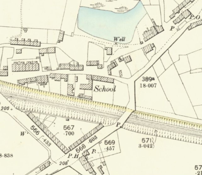 The school building stood on the south side of a road which became known as “School Road.” Redding Square, the centre of the village, lay just to its south, and a small loch (now a park) to the north. In the early 1850s the Midland Junction Railway was driven through the area, separating the school from the square.