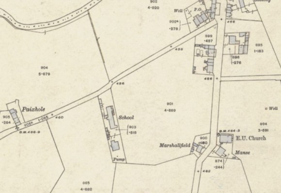 When the Slamannan School Board was formed in 1873 it was offered the private school at Dykehead, a mile to the west of Avonbridge, on condition that the managers of the school at that time were allowed to use it for religious meetings in the future. This was agreed to and it became Dykehead Public School. The Board soon realised that the building was unsuitable because of its age, size and location and started to look for a site nearer to Avonbridge. At first land at Avonhill belonging to Mr Paton was favoured, but eventually the Board plumped for a site much nearer the village belonging to the Shaws of Dalquhairn. It lay one field to the west of the built-up area of Avonbridge, on the south side of the road to Slamannan – allowing room for the future expansion of both village and school. Negotiations were immediately opened up with the neighbouring school boards at Muiravonside and Torphichen so that a “combination school” could be built. Both were interested but Torphichen were unable to agree terms. Muiravonside was much more amenable, probably because it wanted to close the Avonbridge Subscription School which it had inherited on the north side of the River Avon. Indeed, the relationship between the Slamannan and Muiravonside School Boards, though occasionally stormy, remained work-a-day for half a century, and there was a constant exchange of information.