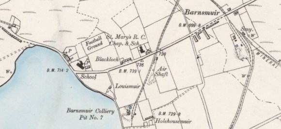 In the 1880s the large-scale working of the Slamannan coalfield extended up to the Black Loch. Many of the colliers housed in the new miners’ rows were Irish and followed the Roman Catholic faith. Consequently they, together with the colliery owners, raised a school in 1885 at Barnsmuir a little to the east of the Limerigg Public School. The schoolroom was used as a chapel on Sundays and is labelled as “St Mary’s R.C. Chapel & School” on the 1899 Ordnance Survey map.