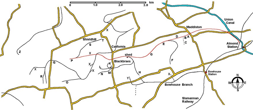 This long and sinuous branchline railway served coking ovens, quarries and brickworks as well as the numerous collieries. and left the Slamannan Junction Railway at Almond Junction (NS 9611 7643) and proceeded west as far as Easter Jaw Colliery at NS 8721 7497 via the Manuelrigg Colliery (NS 9358 7659), Whiterigg & Craigend Colliery (NS 9217 7589) and Gardrum Colliery (NS 8816 7556) – a distance of 10km. In 1890 it terminated after 7.6km but was extended. It passed just to the north of Blackbraes (at NS 9067 7572) – hence its name – with the Blackbraes Sheds for locomotives at NS 9156 7576. From Almond Junction to Blackbraes Station is 5km. It was called the Shieldhill Railway on the 1st edition Ordnance Survey, and the Sheds were then known as Blackbraes Station.