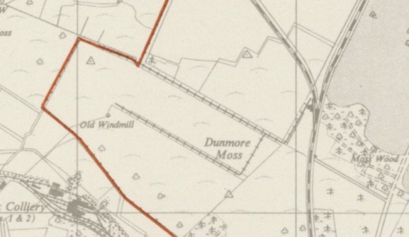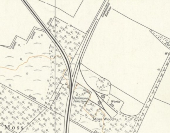 The peat of Dunmore Moss was worked on a small scale over almost a century. A windmill was erected to control the water levels and rails were laid down on banks left for the purpose of removing the peat to a siding at Dunmore Junction. By 1960 the working area had moved to the east side of the railway and the internal rail network was set out with easier curves. The railway to the north of Dunmore Junction was closed in 1950, but a headshunt was left to serve these works.