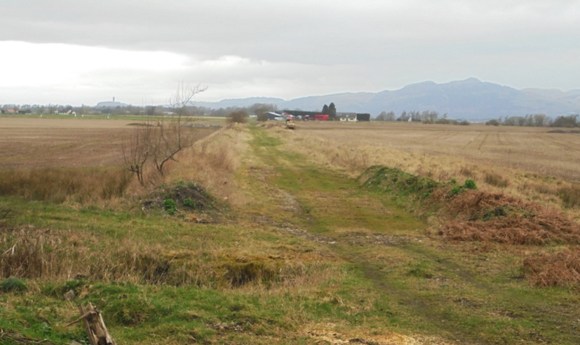 There is another tidy stream crossing for the Pow Burn beside the site of the old Dunmore Pottery. This has a narrow stone-lined channel crossed by steel girders and decked with wooden planks, flanked by steel handrails (NS 8717 8840). Just beyond this it crosses the moss in a prominent cutting – made all the more obvious by the lowering of the ground to the west by the subsequent extraction of the peat – leaving a high spine of old land in place along the side of the railway. In places the cutting has been filled in using rubble from demolished buildings.