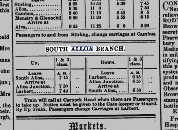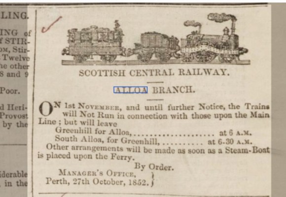“A petition is at present in course of signature, to the Chairman and Directors of the Scottish Central Railway Company, from parties residing in Airth, Dunmore, Carnock, Kersie, &c., for the departure of a train from the terminus of the Alloa Branch Railway at a stated hour in the morning, and likewise for a regular return train in the evening. For some time back the irregularity has been shameful – only one train-a-day, and that one at no fixed hour. Passengers of late have been put to the greatest inconvenience, having often to walk four or five miles to other stations, and then be subjected to the annoyance of waiting sometimes an hour or two for the next train. Previous to the opening of this line, the people here were well accommodated by a coach running between Alloa and Falkirk Station four times a day.”