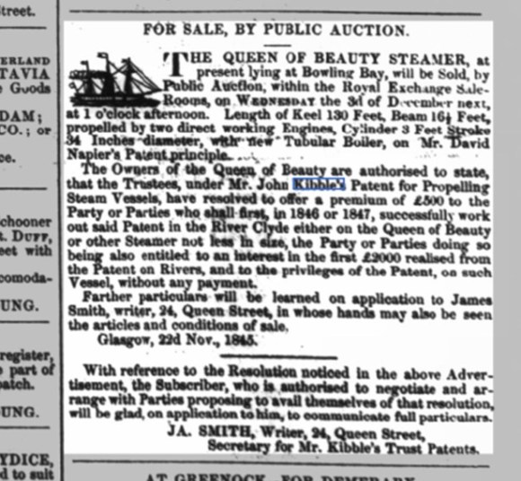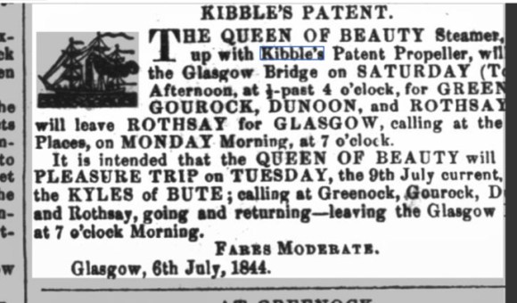 Meanwhile, the Queen of Beauty had been laid up at the Broomielaw in Glasgow over the winter of 1844/45 so that a new boiler could be fitted. The method of securing the floats was also changed in order to improve their reliability. This certainly enhanced her performance, and her usual rate of sailing in the 1845 season from Glasgow to Greenock, with favourable tides, varied from 1 hour 31 minutes to 1 hour 34 minutes; and with adverse tides, two hours. There remained technical difficulties with the Kibble propeller and so she was soon converted to house conventional paddle wheels. Today John Kibble is best remembered for his conservatory which now stands in the Glasgow Botanic Gardens.