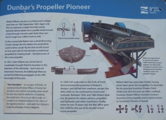 In the summer of 1827, whilst still overseer of the canal, Thomas Wilson visited his home town of Dunbar in East Lothian. Whilst there, he met with Robert Wilson, who was, presumably, a relative. Robert had been experimenting for some time with the idea of a scull or screw propeller for ships similar to those which were widely adopted twenty five years later. He had been having great difficulty getting the establishment to accept the designs and showed Thomas a beautifully worked model which he had made the year before. This wooden model was about 3ft long and contained a clockwork mechanism which could turn the working parts. It could be used to power either the side paddles or a stern propeller. Thomas was obviously impressed and prevailed upon Robert to loan him the model so that he could test it at Tophill and then demonstrate it to his employers – the Forth and Clyde Canal Company. Recalling the event in 1864, Thomas wrote:
