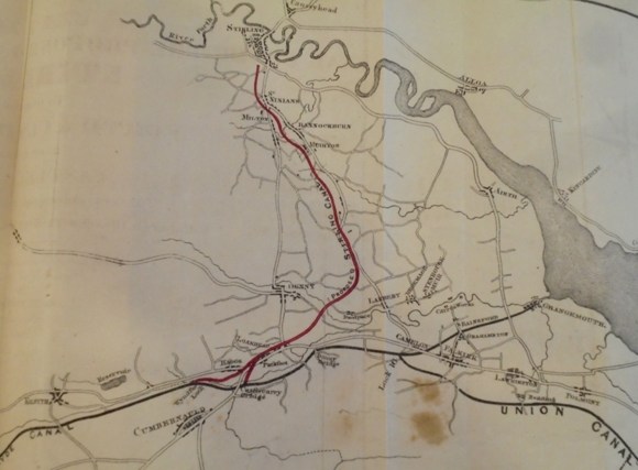 “When the Stirling Canal was first proposed, three different lines were examined – an east, a middle, and a west line, all leaving Stirling nearly at the same point, but at different levels. Of these, the middle line has been adopted, as that keeping free from interference with gentlemen’s pleasure-grounds, and at the same time capable of being formed without locks, preserving the same level water route from Stirling to Glasgow. The east and west lines would have been longer, and subjected to lockage, and must have interfered with the pleasure-grounds of gentlemen living on the line.