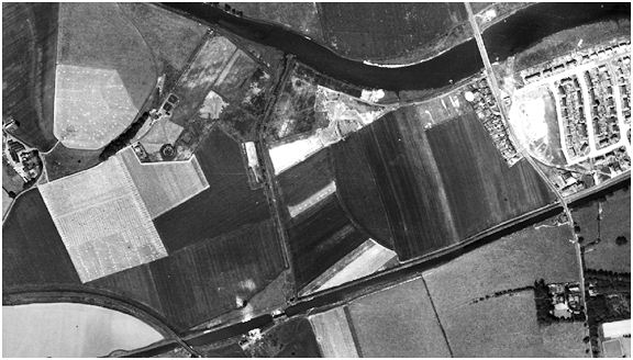 Illus 7: Aerial Photograph showing the line of the Temporary Cut between the River Carron at the top and the Forth and Clyde Canal at the bottom. C1950.