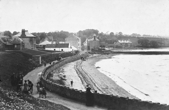 As well as the brick work, Forrest’s map of 1818 shows an alum mine and a Roman Cement Work at Bridgeness, the latter owned by a Mr Taylor. This was a chemical works which had been established around 1813 and later went on to make black ash from bleacher’s refuse. This substance was used in the Leblanc process to produce sodium carbonate which was needed for the manufacture of soap and glass. The process used at the works released hydrogen chloride into the atmosphere, causing severe damage to vegetation over a wider area. Not surprisingly therefore, in 1827 a court case was brought against Taylor by the owner of Blackness Villa which lay immediately to the east. One of those that gave evidence was Spence Wood who had been sea-bathing at Blackness the year before. This leisure activity had replaced shipping in the limited economy of the village. 50yds further east was the house of Mr Jeffrey who had resided there all of his life. In the summer months he let part of his house to families who went there for the sea-bathing and at that time was accommodating eight families at a time. Unfortunately, in July 1828 one of the bathers, Mr Rankine, a law-student, the son of a bookseller at Falkirk, was drowned. It was such middle-class professionals from central Scotland who were vacationing at Blackness. It never reached the mass popularity of seaside resorts such as Portobello because of the difficulty of access. It was never provided with a railway link. The Linlithgow Guildry placed a large wooden bathing-house in front of the Green, and installed garden seats on the Green itself, to promote leisure activities.