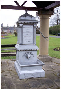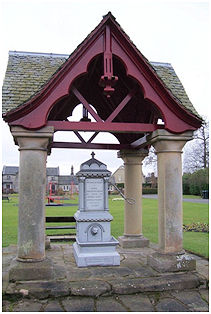 The new cast iron pump and ornamental housing were set inside a rustic shelter consisting of a slated roof with four open fretted gables supported at each corner on chunky Doric columns. The whole is set on a two tiered stone platform. The cast iron work was made in London with a square pillar at the south end housing a lion-head spout that debouches water into a low level trough. Above the chamfered plinth the pillar was shallow arched recesses with ropework hood-moulds. The upper section has columns at the corners with a denticulated entablature and a pointed top. It bears inscriptions on two sides: