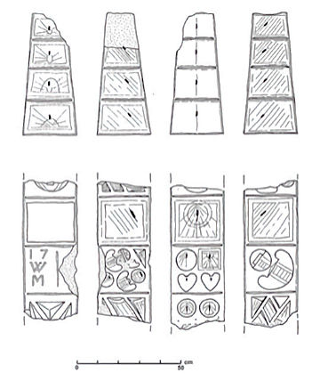 As is normal for the developed obelisk type of sundial it was dated on the north side – 1716; below which were the initials W.H. and M.M. Stevenson was puzzled by these initials as they did not match any of the owners of Carronhall. However, we can confidently say that the sundial was originally at Letham and that the first set of initials are those of William Hamilton who bought the estate in 1716 from George, Lord Forrester. In 1728 William Hamilton disponed Letham to Thomas Dundas including “the dwelling house of Letham… with the meal ark in the said house and sun diall standing in the garden” (John Reid notes; GD 65/174).