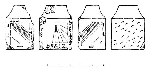 It consists of a cube with dial faces on three sides and the fourth pecked to key it into the masonry at the foot of a skew. The top is extended upwards forming the curved shaft of a ball final. It was noted by the RCAHMS as standing in the garden of a cottage just to the west of the bridge at Chartershall, having been dug up on the spot (RCAHMS 1963, 315).