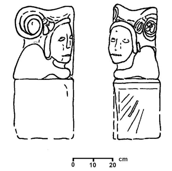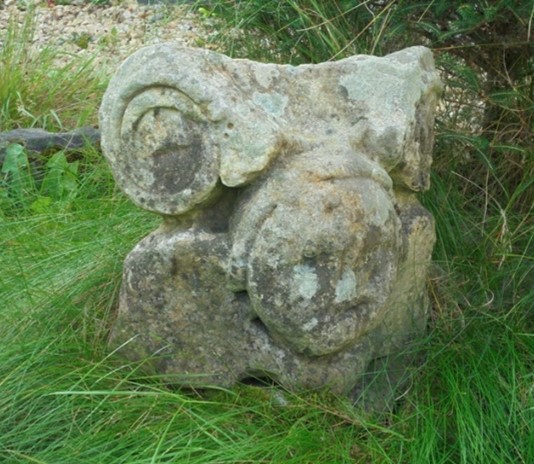 In the garden of a house on the corner of Woodlands Crescent (NS 8843 7971) an old sculptured stone has been used as a garden ornament and was brought to the author’s attention in 2023. Its origins are unknown but it probably came from a demolished building in the nearby town centre. The cubic base of the stone is embedded into the garden bed leaving a winged face exposed as decoration. The winged soul occupies the corner of the stone and is surmounted by scrolls containing simplified floral motifs. Stylistically it dates to the mid-18th century. Faint traces of the diagonal rays of a sundial may be seen on one side of the base, along with a rectangular depression which would have housed the gnomen. The other outward face of the base has been lost. The base measures 0.3m x 0.24m and is approximately 0.3m high.