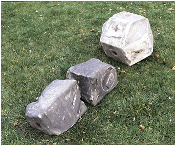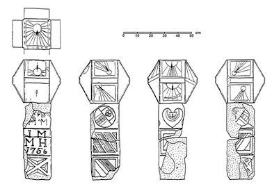 This sundial was unearthed in the garden of 1 Garden Street in Falkirk (NS 8916 8008) in April 1991. It consists of three damaged stones and a putative plinth. The shaft is 0.21m square and 0.55m tall and had been broken in two. Some areas of the faces had been lost with the damage being worst on the south and east sides. The polyhedron head is more complete, although some flaking had occurred on the south side. It bore traces of black and white paint which appeared to have been the basal layers for a surface colour of green and red respectively. The paint, however, was later than some of the damage to the corners of the head. The remnants of iron gnomons were set in lead. The possible plinth took the form of a dressed stone 0.31m square and 0.10m thick with chamfered upper edges. Dowel holes occurred in the bottom and top of the shaft and in the bottom of the head, but none appeared on the suggested plinth which may have been a lower setting stone.