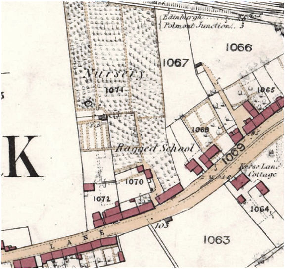 The sundial can be seen on the 1862 Ordnance Survey map towards the north side of a formal garden set out with a series of north/south paths associated with the 6.655 acre nursery off Kerse Lane. In 1853 this nursery belonged to James Miller, wright, and was leased by Peter Booth. Miller has the same initials as those on the sundial and it would not be surprising if the same family owned it for a century.