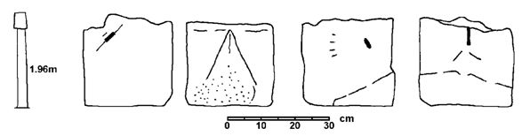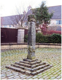 The only mercat crosses in the Falkirk district that we have details of are the two surviving examples at Airth. The older of the two was already known as the Headless Cross in 1619 and the current head is evidently from around that date. The reason for it being headless is unknown, though that has not stopped people from speculating. It is possible that it was originally surmounted by a cross which as a symbol of the Catholic Church was removed. The sundial would have been a far more acceptable top. The cross now takes the form of a square stone pillar, 7ft 2ins tall and 9 ¾ins square, with a slightly larger head bearing the remnant of a sundial of probably 17th century date. Three of the faces of this 11ins cube have linear sockets in them to hold the gnomon. One of these is vertical and there are feint traces of dial lines suggesting a symmetrical arrangement consistent with a south-facing sundial. The faces to either side have slots set at 45 degrees for the west and east faces, whilst the remaining (presumably north face) has traces of a more elaborate design.