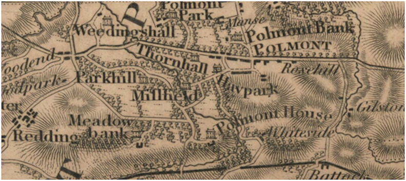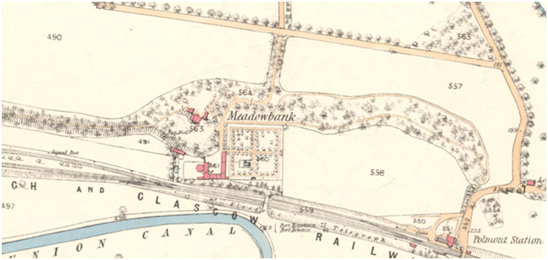 Meadowbank estate was part of the Lands of Redding and the estate seems to have been formed in the late 18th century by Henry Johnston. Roy, in the mid 18th century, shows the area as moorland and the name of Meadowbank appears to date to the time of Johnston’s arrival. It changed hands through sale several times: