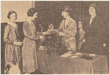 Illus 16: Lady Whitson presenting the Athletic Cup and also the Senior Tennis Cup to Miss A Bowie. On the left is Miss M Stein, the Junior Tennis Champion. On the right Miss Nimmo, Principal of the School (Falkirk Herald 15 July 1933).