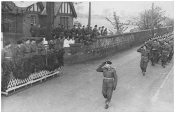Illus 20: Polish Soldiers marching along Salmon Inn Road with the Saluting Platform at the entrance to St Margaret’s with the Lodge in the background.