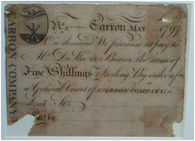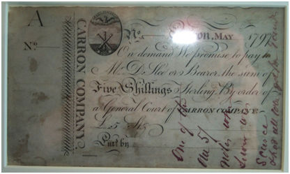By 1790 the Carron Company had made strong financial progress since the crisis of 1772 and under the careful management of the Staintons it built up reserves of capital. Despite this it was having problems paying wages and smaller invoices due to the scarcity of silver and low denominational banknotes. The Merchant Bank of Stirling and the Thistle Bank both issued such notes which made their appearance in the area but they were not sufficiently common or trusted. Dividends at Carron Company were reasonably good and the management were loath to see more of its profits dissipate on them. The General Court of Carron Company agreed at its meeting in 1795 to issue promissory notes of five shillings and upward (Watters 2010, 116). The Carron name provided a high degree of confidence in the issue and these were generally accepted by the public at large.