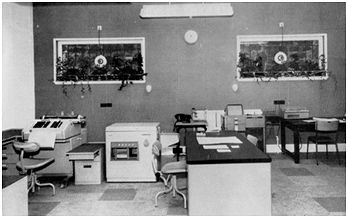 When completed at the Falkirk head office in 1960 the “Electronic Control register Posting Department” was the first in Britain. A pilot scheme had operated from 1958 at Bathgate where a centralised ledger posting system was introduced and two of the adjacent part-time offices had been brought into the scheme within eighteen months. The “mechanical machine” used was a Burrough’s Sensimatic. In 1960 the remaining eleven branches were parented on to a similar centralised ledge posting system based at Falkirk using two Burrough’s electronic bank book-keeping machines, and auto-readers and a twin microfilm unit. Ledge cards backed with three magnetic stripes were used. These absorbed electronic impulses from the machines to record the last four figures of the account number and the aggregate balance, made up of interest and principal.