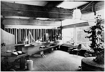 Opened in new premises 9 October 1961 in the South Muirhead Road temporary shopping centre. The office was of open design with a depositors’ “rest centre” having seating contrived from two large millstones obtained from the Old Mill in Cumbernauld, contrasting with the fabric-finished floor and modern desk unit and interviewing cubicle.