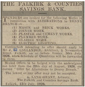 Alterations to Bank for Falkirk & Counties Trustee Savings Bank – Denny Branch Falkirk Herald, 26 July 1926 Share this: Click to share on X (Opens in new window) X Click to share on Facebook (Opens in new window) Facebook Like Loading...