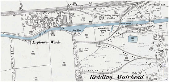 The production of detonators was obviously vital for waging war and the output had to be considerably increased. In 1879 the factory for producing fulminate of mercury had been built at Reddingmuirhead. It remained the only building on that side of the canal until 1896 when 2 acres were developed between then and 1912. At the beginning of 1914 the whole factory covered 19 acres and employed 450 people. By the end of the First World War it had grown to occupy 45 acres and employed an average of 800. J G Callendar was involved with this expansion work, designing and supervising the construction of the network of huts that spread further south up the hillside from the Union Canal. JG Callendar would have been 32 years old at the beginning of the war and this work probably prevented him from being called up.