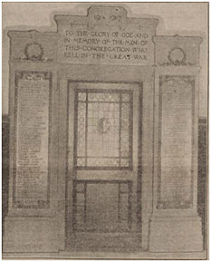 In May 1922 J G Callendar designed a war memorial for Falkirk Parish Church in the form of a doorway in Blaxter stone on the south inside entrance into the main church from the tower vestibule. This included uprights on either side into which bronze tablets were inserted containing the names of all connected with the church who died in the war. The whole was surmounted by an ornate canopy bearing the inscription “1914-1919. To the glory of God and in memory of the men of this congregation who fell in the war.” An oak door with leaded glass upper panel containing a wreath was an integral part of the composition. Some structural work had to be undertaken. The overall cost was over £300 and it was dedicated on 1 April 1923.