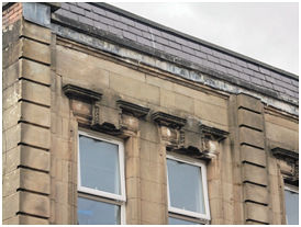 In the late 1970s the stone parapet wall was replaced by a slated wallhead and the domed corner feature, the finials and the tops of the pilaster were removed, badly affecting the aesthetics.