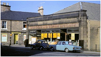 J G Callander’s second commission for the Falkirk and District United Co-operative Society Ltd in 1931 was for a smaller store in the Thornhill area serving the suburb near Victoria Park. Although smaller in scale than that at Larbert it has much the same style with the use of pale buff sandstone, a granite basal plinth and large plate glass windows for the façade. It too has a short flat parapet wall with carved detailing and horizontal panels of leaded glass above the main display windows. This fronts a large piended shed.