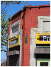 The outer stonework of the façade is now painted red whilst the inner frame with its dentilled border is cream, thus exaggerating the geometry of the banding. By contrast the leaded windows are masked by the protective shutters. However, the building is still a handsome one. The dentillation echoes that often found on concrete fronts of the 1930s, as does the stepped nature of the border; it is even more noticeable on the two short lengths of façade that take this decoration round the chamfered corner into Mary Street. When the store was built this was a busy through road and hence this corner received special treatment.