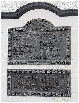 In 1923 a war memorial tablet designed by J G Callander was placed on the outside wall on the north-west corner of the Falkirk Tryst Golf Clubhouse facing the first tee. The bronze tablet bearing the 19 names of the club members who died in the Great War was attached to a red freestone base executed by JJ and P McLachlan. It is surmounted by the club motto “Far and Sure” and the dates “1914-1919.” The main inscription reads: “To the Glorious Memory of the members of this club who laid down their lives in the Great War.” The lower border of the plate bears the words “They played the Game.”