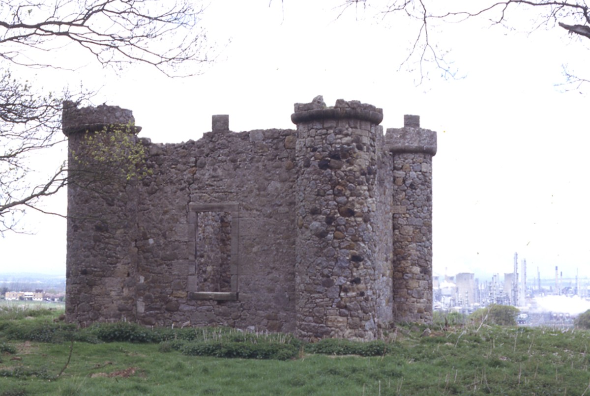 A folly belonging to Avondale House stands on a prominent knoll to its south and is clearly visible from the M9 motorway. It takes the form of a small square (8m by 8m) pavilion or gazebo with large rectangular windows in the north and south sides, an entrance doorway on the east and an internal fireplace in the west wall. The door and window surrounds have backset margins suggesting that the building was originally harled. The walls are made of small quarried sandstone and whinstone from field clearance. A small round turret has been added to each external corner. Although not properly tied to the main block these were evidently original. Each turret has a corbelled top capped with battlements.