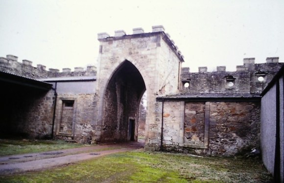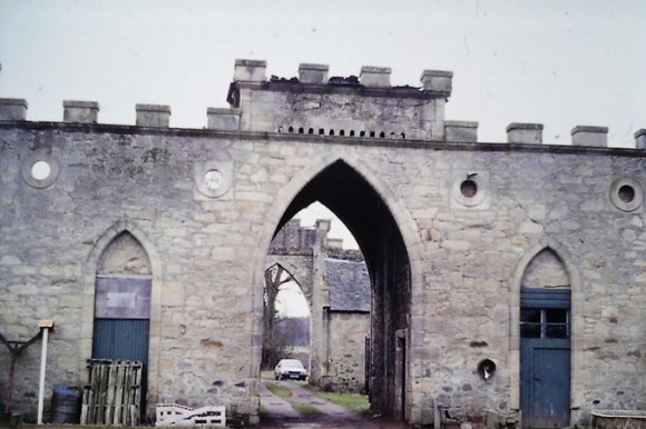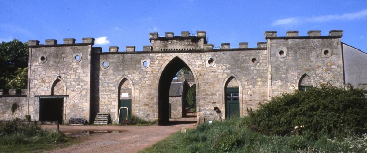 This must rank as one of the finest stable blocks in Scotland displaying a unified plan that ties it into the layout of the estate. Its central axis with its two imposing gateways sits astride the main approach avenue. Visitors enter the estate from the west through an ornate gateway and continue along a straight drive edged in by walls and hedges. They then pass under the lofty west archway into the spacious courtyard of the fortress-like stable block, through the tower passage opposite to emerge into open parkland with the sweeping curve of the drive in front of them leading across the grand lawn to the main door of the spreading Gothic House.