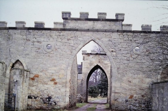 The lofty pointed arches, the crenellated wall-heads, combined with the series of small roundel windows with backset margins give the stable complex the appearance of a fort which would be at home in a Beau Geste film featuring the Foreign legion.