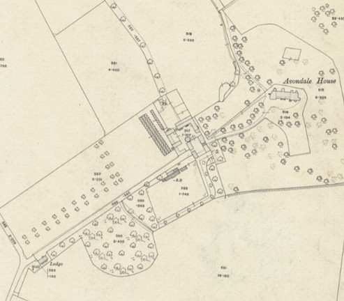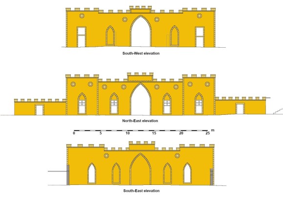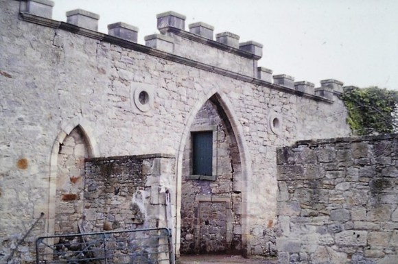 The architectural theme for the stable block is an Arabic fortress with a battlemented wall head, squat towers, roundels set high in the tall curtain walls, and pointed arches to the windows and gateways; devices which were popular in Scotland in the first quarter of the nineteenth century when there was a revival of interest in the Gothic architecture of the medieval period. Here, however, the style points to a slightly earlier period. There is a marked similarity to the Gothic style used at the deercote at Sudbury in Staffordshire which was built about 1720–23, of red brick with sandstone dressings. Closer to hand we have the Fyrish Monument in Easter Ross which was built in 1782 for Sir Hector Munro who had served as a general in India. That folly has three pointed arches, the central one larger than those to either side, and was a representation of the gate of Negapatam near Madras which General Munro captured. A similar arrangement of three arches occurred on the mansionhouse at Avondale itself (SMR 264). Avondale contains no inscribed stones to provide an exact date or the name of the patron but the stable block is clearly depicted on Grassom’s map of 1818. A date in the mid 18th century would be appropriate.
