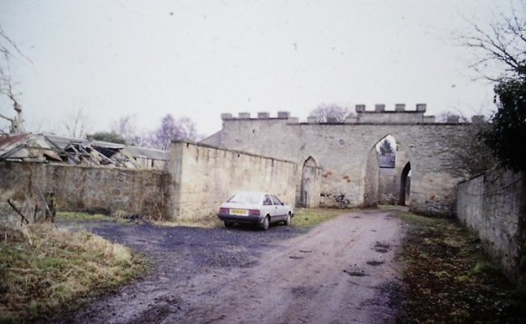 To the north of the stable block is a later larger courtyard containing the home farm which is now derelict. To the south is the old orchard, and attached to the west side of this is a large walled garden – both bounded by ha-has to separate them from the pasture sloping up the hill to the castle-like folly (SMR 266).