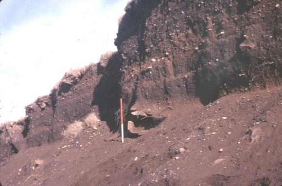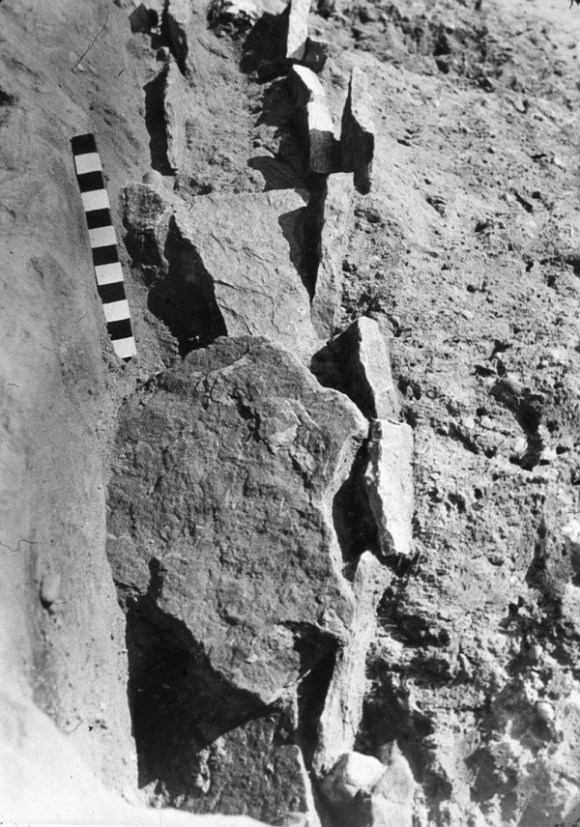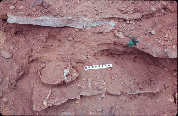1979: Tom Astbury photographed a long cist burial at the eroding quarry face.