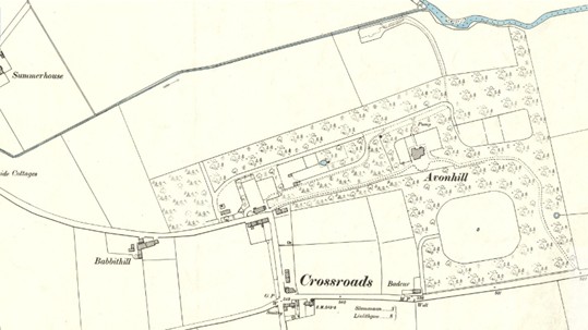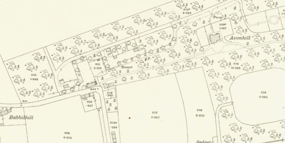 A doocot formerly stood immediately to the north of the west carriage drive to Avonhill House. The House was built in 1878 for James Paton, publisher, 5 St James Square, Edinburgh. In 1883 he bought a thin strip of ground in Badcur from Elizabeth Gaston Ralston Waddell and used it to provide a main western drive, at the end of which a lodge was built in the same style as the main house. It was probably at this time that the doocot was erected. The rectangular structure is shown on the 1897 Ordnance Survey map, but it was only in 1916 that it was labelled as a dovecot. The present West Lodge has a squat, square crenellated tower and the doocot may have been of the same form.